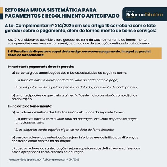 Ainda, a Lei Complementar nº 214/2025 em seu artigo 10 corrobora com o fato gerador sobre o pagamento, além do fornecimento de bens e serviços, vejamos:
