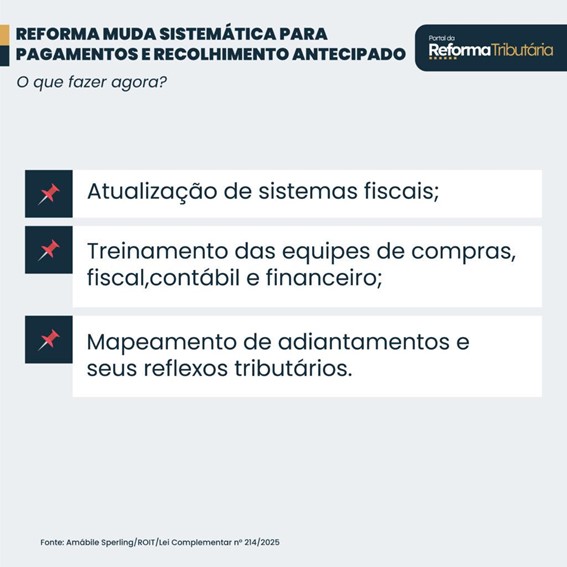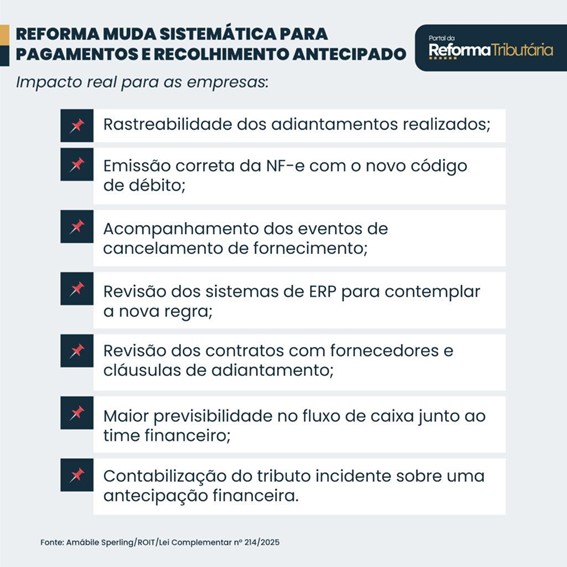 Além disso, o controle dos créditos tributários vinculados aos pagamentos antecipados se torna mais complexo — exigindo sistemas robustos e integração com o financeiro.