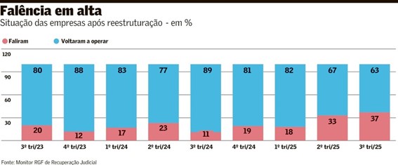 Quatro em cada dez empresas não voltaram a operar no terceiro trimestre após finalizarem o processo de recuperação judicial. Foram à falência. A taxa de sucesso caiu consideravelmente em relação a igual período de 2024, em meio a um novo recorde no volume de reestruturações. É o que mostra o Monitor RGF, da consultoria RGF, obtido com exclusividade pelo Valor.