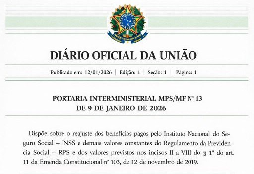 Foi publicada a Portaria Interministerial MPS/MF nº 13, de 9 de janeiro de 2026, do Ministério da Previdência Social e do Ministério da Fazenda, que divulga a tabela de faixas para atribuição de alíquotas previdenciárias, bem como limite de salários de contribuição ao INSS, além de reajustar os benefícios pagos pelo Instituto Nacional do Seguro Social (INSS) e os demais valores constantes do Regulamento da Previdência Social (RPS).