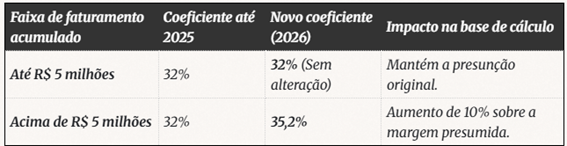 Imagine uma empresa de Prestação de Serviços (cujo coeficiente de presunção padrão é 32%). Veja como a conta muda ao longo de 2026: