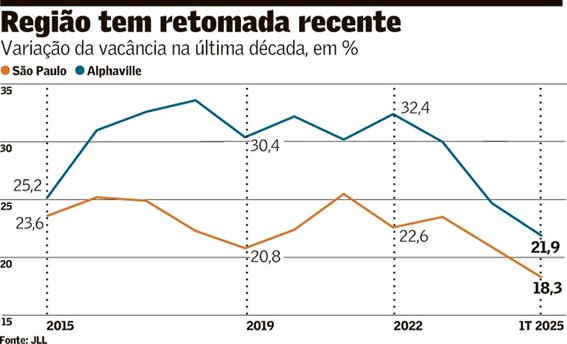 Desde 2021, segundo a JLL, só houve uma entrega de prédio novo em Alphaville, com 12,3 mil m2 de área bruta locável (ABL), o que ajudou na redução da vacância. A CBRE contabiliza também a entrega de um prédio feito para a multinacional DuPont.