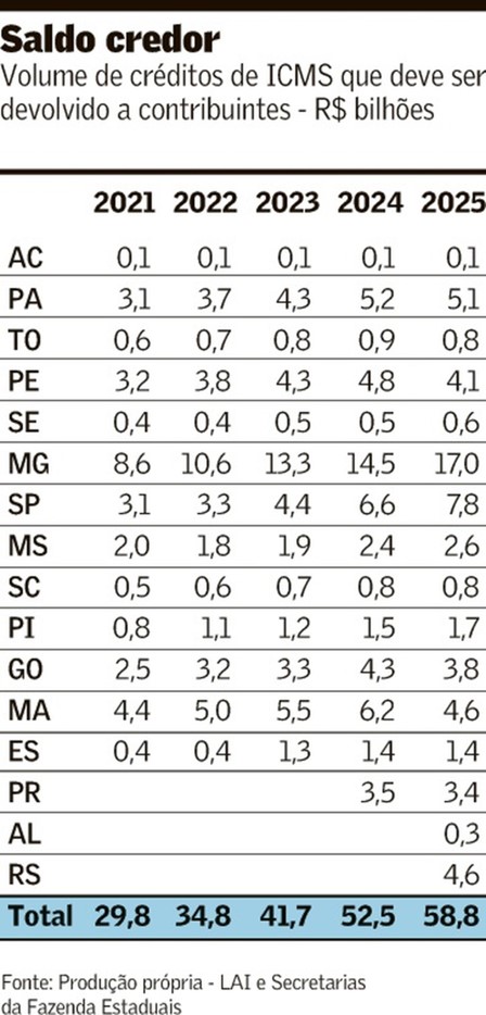 Treze Estados acumulam R$ 50,5 bilhões de créditos de ICMS, valores que devem ser devolvidos às empresas. O montante, referente ao fechamento de 2025, é quase 70% maior que o de cinco anos atrás. Em 2021, o estoque era de R$ 29,8 bilhões. O levantamento foi feito pelo Valor via Lei de Acesso à Informação (LAI) ou por contato – todos os entes foram procurados, mas nem todos responderam. Somado a Alagoas, Paraná e Rio Grande do Sul, que não enviaram o histórico completo, o estoque sobe para R$ 58,8 bilhões.